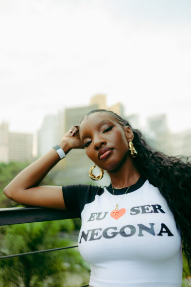 A música me ajudou muito nisso, nessa questão de identidade, o ponto principal não é só ouvido, ainda mais Música Negra, vem com vários elementos culturais, estéticos. Consegui estudar várias maneiras de ser Negra através da música. Não conhecia o Dancehall, aí eu comecei a ouvir. “Vi varias Mulheres Pretonas, sem medo de ser quem eram”, vários cabelos, não conhecia tranças, conheci. Fiz tranças! Aí eu falei- Cara! Gostei muito disso! Ouvia Hip Hop, conheci várias coisas antigas… Bahamadia, Queen Latifa, aí eu comecei a ver como elas se vestiam, o que elas cantavam. Tudo o que eu aprendi foi com outras pessoas Negras.