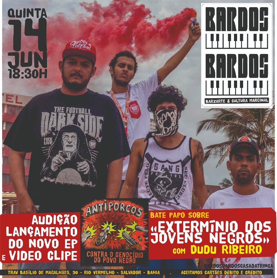 O EP Contra o Genocídio do Povo Negro, da banda Antiporcos, sai pelo selo Trinca de Selos, através da Brechó Discos. O lançamento oficial será no dia 14 de junho no Bardos Bardos, que fica no Rio Vermelho, fácil de encontrar, mais fácil ainda chegar lá.