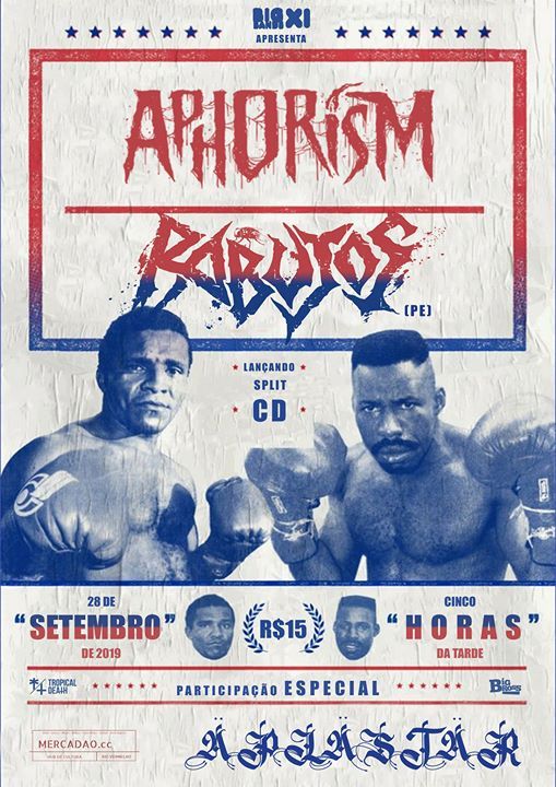Essa “tensão” entre Bahia e Pernambuco, que não deixa de ser também uma forte conexão entre os dois estados, está muito bem representada pelo cartaz elaborado para divulgar o show entre as bandas Aphorism (BA) e Rabujos (PE), parte da programação do XI Festival Bigbands. Essa noite do festival recebeu o nome de “Noite Tropical Death”. O flyer anunciando o show é uma versão do cartaz de divulgação do documentário “A Luta do Século: Todo Duro vs Hollyfield“, que aborda a rivalidade entre os boxeadores já citados no início desta matéria.