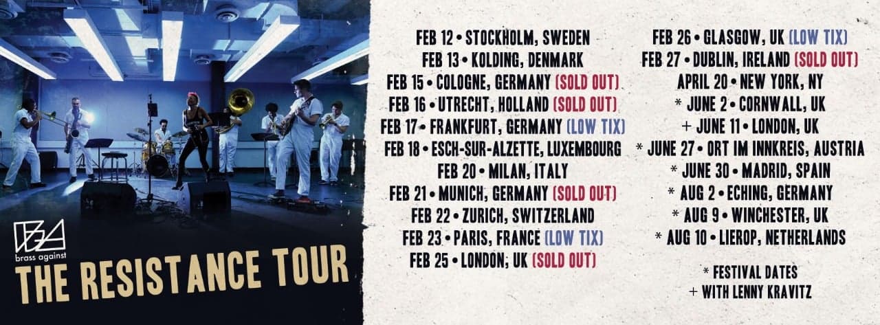 O Brass Against iniciou na última terça feira (12/02) sua tour europeia, a qual se estenderá até agosto desse ano e terá como participação, na apresentação em Londres, o músico Lenny Kravitz.