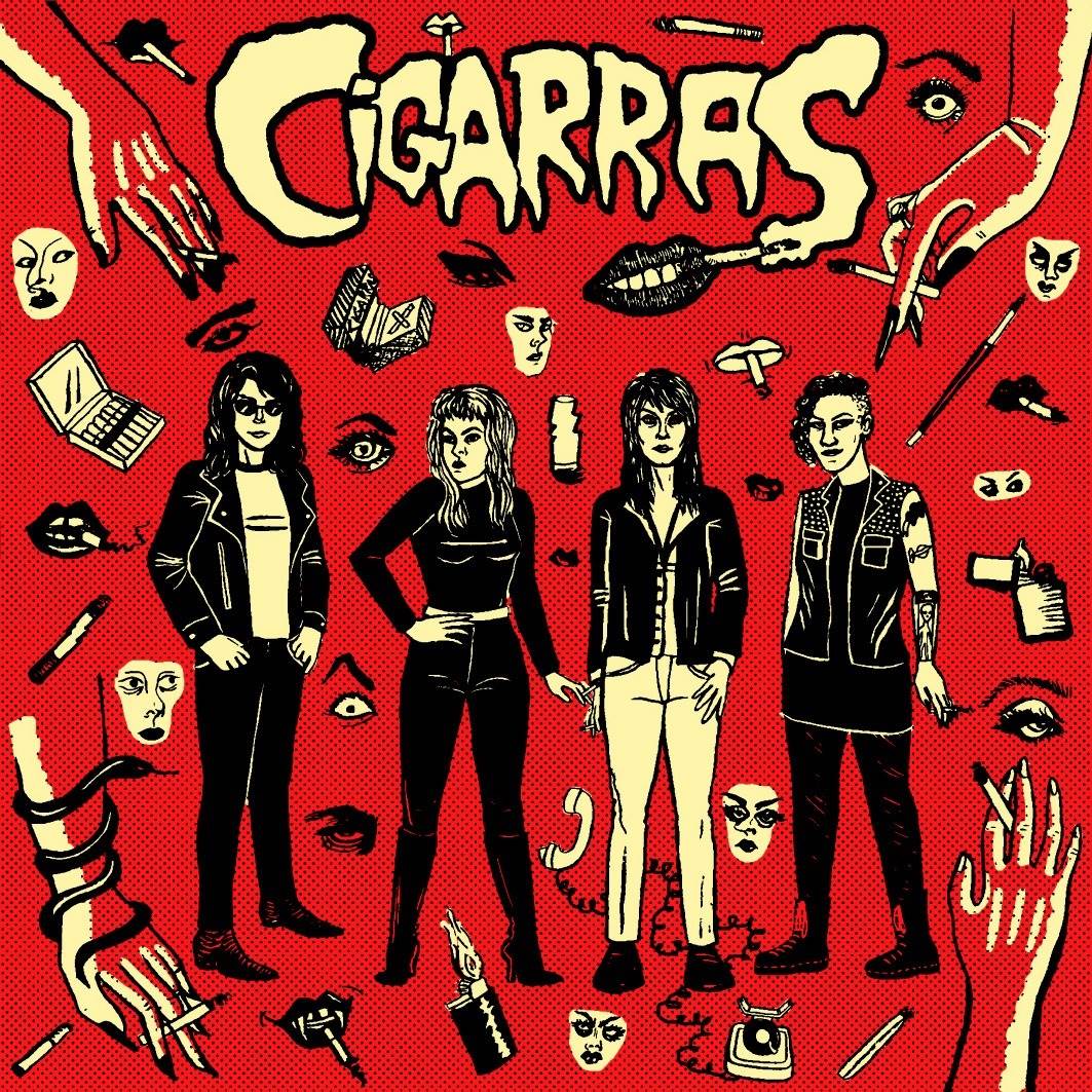Ao jogar Cigarras na busca do Spotify e ver a capa do último EP da banda, fui surpreendido pelo esfacelamento da minha concepção prévia do nome da banda. Isso porque a capa do EP traz um arte fenomenal, com várias bocas tragando cigarros, dedos na clássica posição de segurar o bastaozinho de nicotina, carteiras de cigarros abertas, guimbas de cigarros espalhadas pelo desenho, as integrantes da banda segurando cigarros.