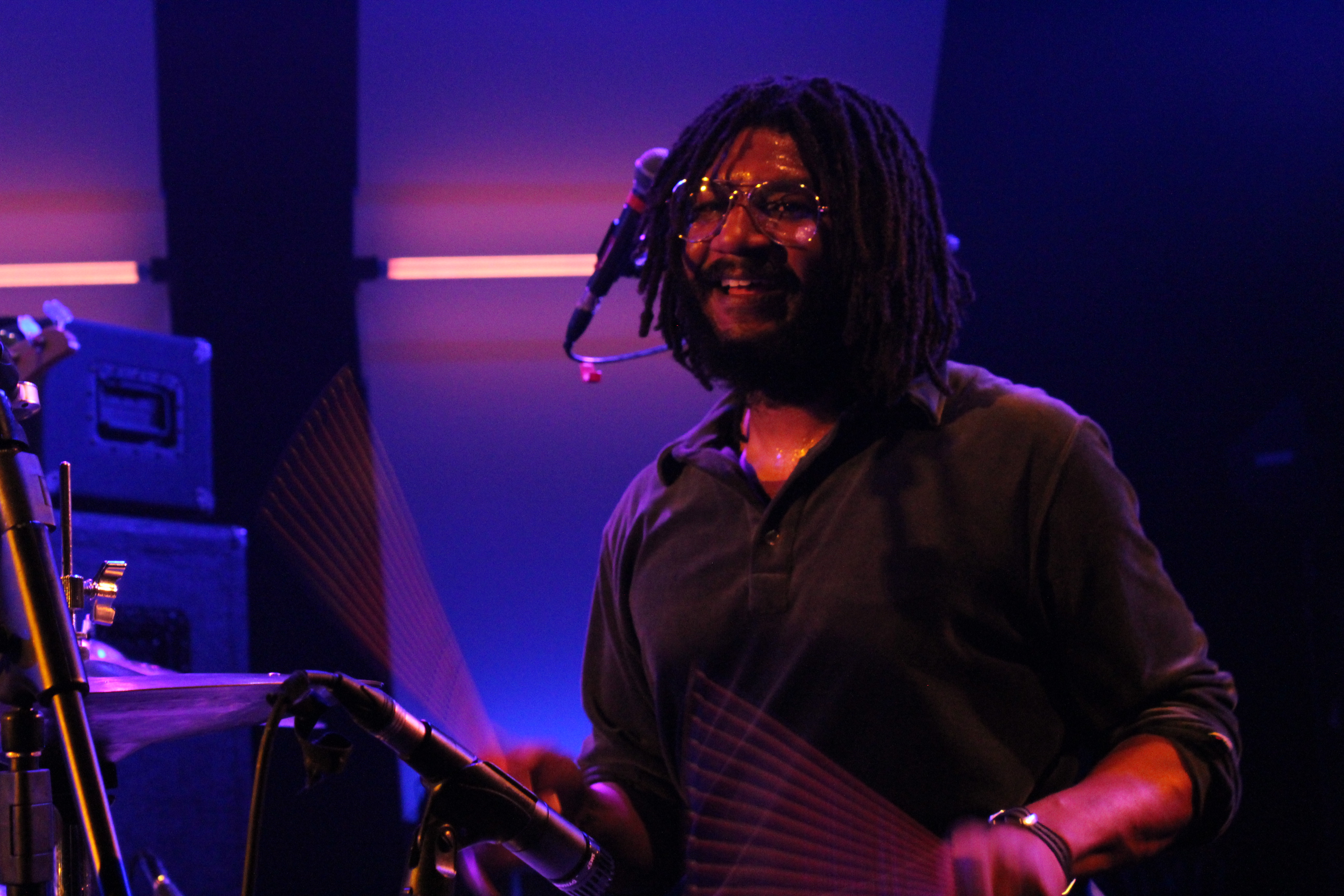 Foi interessante reparar como seu modo de tocar mudou, se comparado à abordagem utilizada na banda de Thundercat. Com a Georgia, Justin se manteve focado em manter o balanço do Funk pulsando, sempre com muita propriedade, variando o peso com uma facilidade absurda e trampando com um jogo de pratos repleto de timbres muito interessantes.