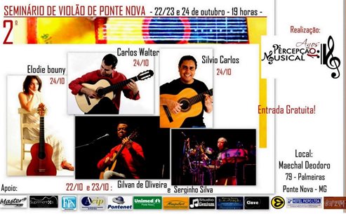 Sendo o violão tão importante para a música da cidade nada mais justo que a promoção de um evento dedicado exclusivamente ao instrumento. Acontece entre os dias 22 e 24 de outubro o II Seminário de Violão de Ponte Nova produzido pelos professores da Percepção Musical Wesley Costa Melo e Davi Primavera. Serão 3 dias em que grandes violonistas de projeção nacional farão concertos dentro de um formato que promove a interação entre músicos e público. O palco da Percepção Musical permite essa aproximação mais íntima entre os concertistas e seus espectadores devido ao ambiente acolhedor da escola. Nada daquela formalidade que impõe o distanciamento entre o músico e seu público, tornando a apresentação enfadonha para aqueles pouco acostumados à dinâmica destes eventos. Há uma organicidade que rompe a ideia do palco como centro difusor da música, expandindo a percepção dos espectadores sobre a experiência musical com a qual estão em contato.