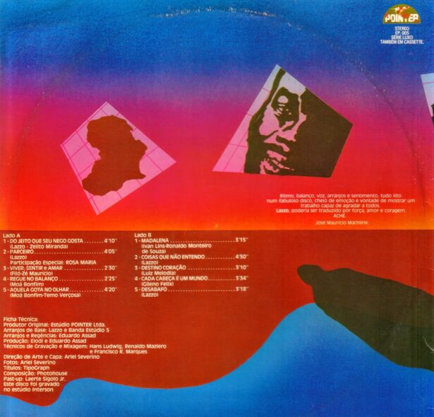 O disco se encerra com a composição de Lazzo, “Desabafo” somente com Eduardo Assad, somente teclado e voz, em uma interpretação magistral do cantor e compositor baiano. Lançado em 1983, o disco era o mais popular da Pointer e Lazzo chegou a fazer matéria no Fantástico da rede Globo, infelizmente esse vídeo não está na internet. Há 40 anos, uma das vozes mais impactantes da música popular brasileira, estreava com um LP quase todo dentro de uma estética musical do reggae, infelizmente esse disco não está hoje nos perfis de streaming oficiais do artista, ainda.