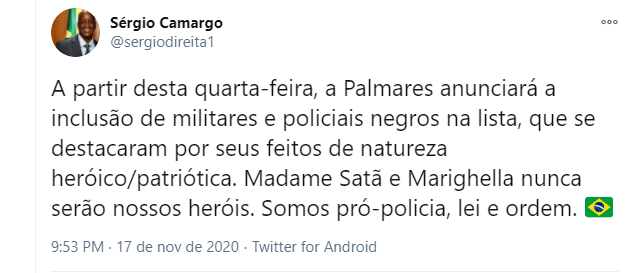 “Assinei hoje portaria que moraliza a lista de personalidades negras da Fundação Palmares. O critério de seleção passa a ser a relevante contribuição histórica. Haverá exclusão de vários nomes. Novas personalidades serão incluídas em razão do mérito e da nobreza de caráter”.