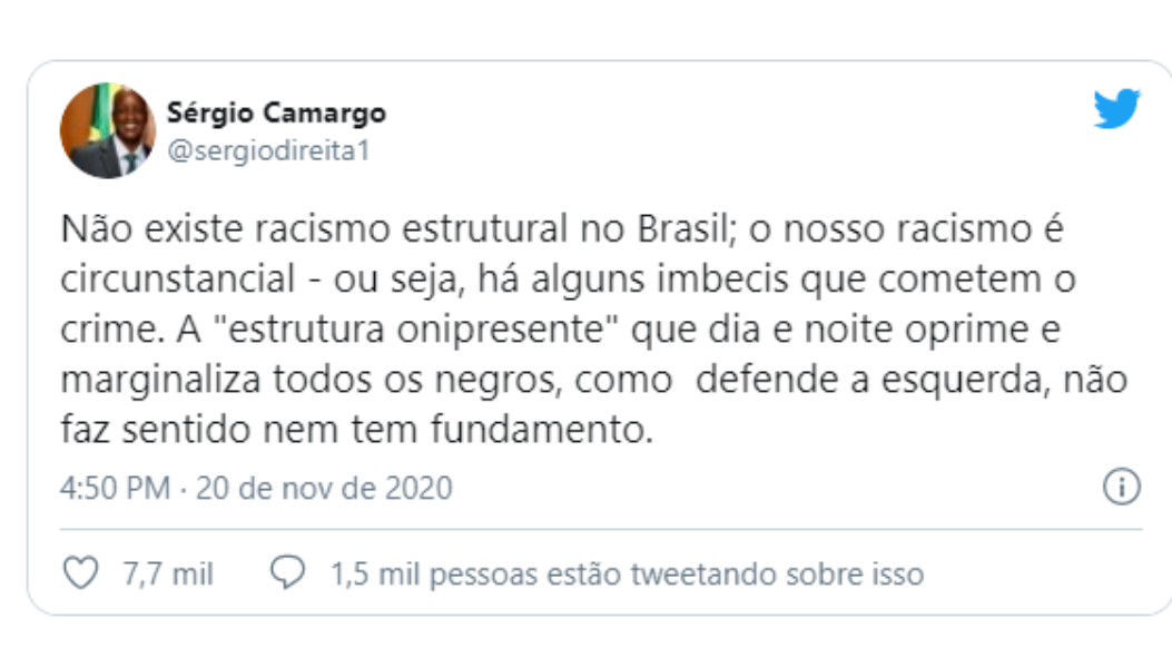 Impede que a Fundação Palmares celebre o Mês da Consciência Negra (veja aqui), o que não causa surpresa, uma vez que já criticou publicamente o Dia da Consciência Negra e afirmou não haver racismo estrutural no Brasil. Conforme você pode ver na foto ao lado do twitte feito no dia 20 de novembro, data de morte do líder preto Zumbi do Palmares, que também dá nome à instituição que ele presidente e que Camargo já disse se tratar de um falso herói dos negros (veja aqui).