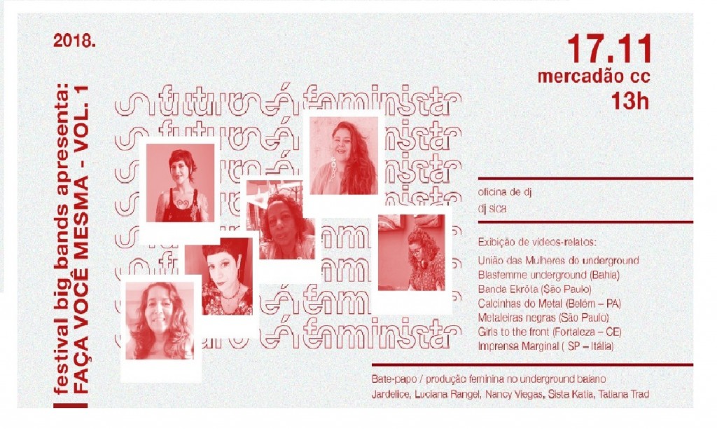 A décima edição do Festival Bigbands acolheu em sua programação o evento FAÇA VOCÊ MESMA: PRODUÇÃO FEMININA NO UNDERGROUND VOL.1 , cuja organização, conceito e curadoria teve em Ana Lima e Jamile Marques do Coletivo Mosh Like a Girl e Debie do Crust Or Die Colletive, Distro & Label suas agentes realizadoras.