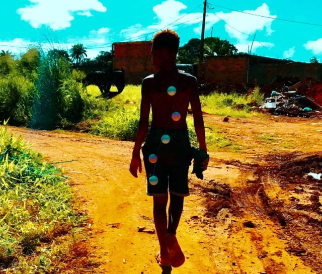 “Canto bonito do bem-te-vi Pipa cortando igual bisturi Corta pra cena do matagal Um corpo boiando, um menino ri /Criança brincando nas ruas Enquanto o feijão tá no fogo As mães tão na porta da creche Polícia passando de novo /Arrocha na casa do lado O cheiro é de arroz com ovo O ronco das motos subindo Diz quais ligações do asfalto com o morro”