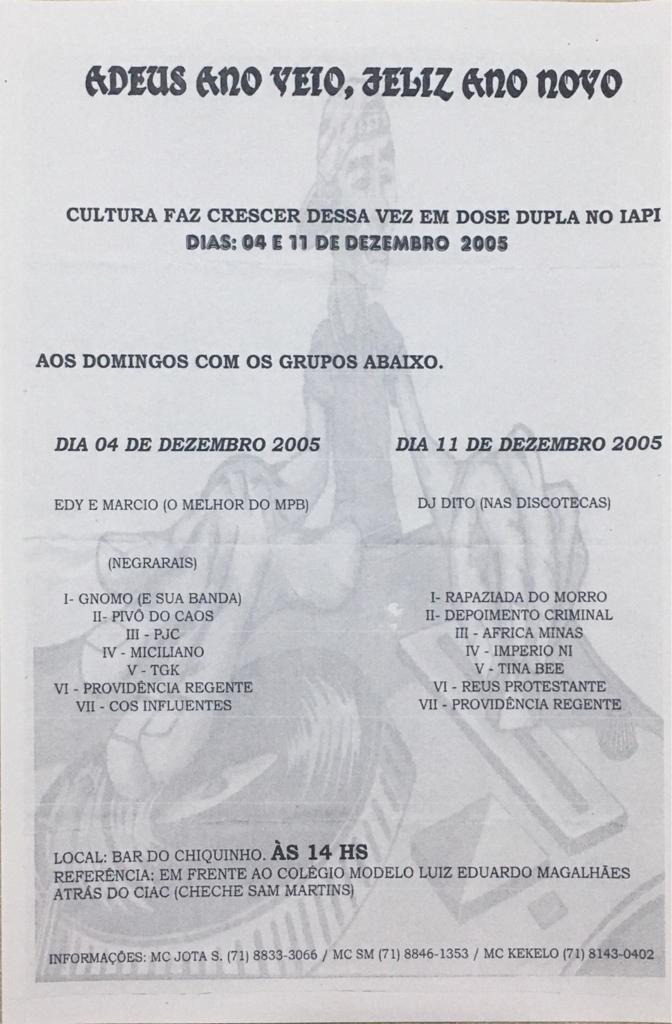 “Pernambués e o Hip Hop Solidário: O Hip Hop de Pernambués é sempre lembrado não somente pelas suas edições, por onde passaram diversos dos grandes nomes da cena do Hip Hop da cidade e região, mas também por suas ações sociais, para além da cultura dos elementos. Como o próprio nome nos sugere a articulação política e social são duas das marcas do “Rap de quebrada” praticado por esses verdadeiros operários a serviço do Hip Hop soteropolitano.