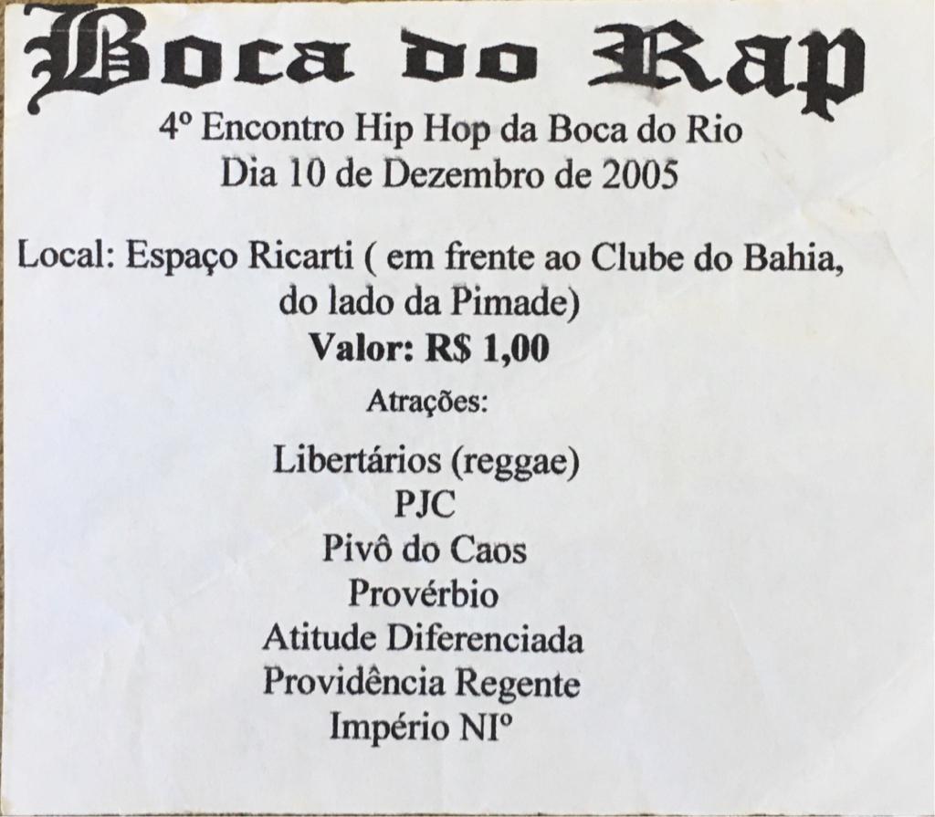 Tradição e longevidade, são duas das características desse que foi um dos maiores eventos de rap de quebrada já produzidos na cidade, o Boca do Rap, realizado entre os anos de 2005 à 2011, quase sempre era realizado no Espaço Escologia. Mas que também tiveram edições realizadas em outros espaços importantes, e aqui vale citar o Espaço Ricarti, onde foram realizadas suas primeiras edições, e também no Espaço Transa, mas sempre na região da Boca do Rio.