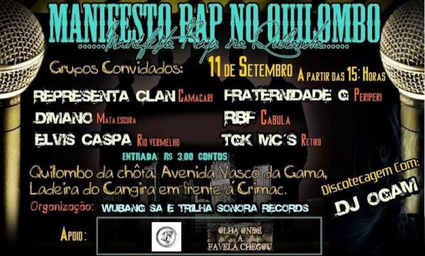 O mano também nos relembra que diversas ações culturais ocorreram por um tempo, até o fechamento temporário do espaço. Ainda a respeito das ações especificamente voltadas pro Hip Hop, ocorreram os eventos batizados de – Manifesto Rap No Quilombo, em que nas diversas edições, se apresentaram no Quilombo muitos dos principais nomes do Rap, não só de Salvador, com também da região metropolitana e até de fora do estado. Nomes nacionalmente consagrados como Gog, Dexter, Kl Jay e do baiano radicado em São Paulo, João Basílio (Ibotirama Records) também deram amostras de suas artes no espaço.