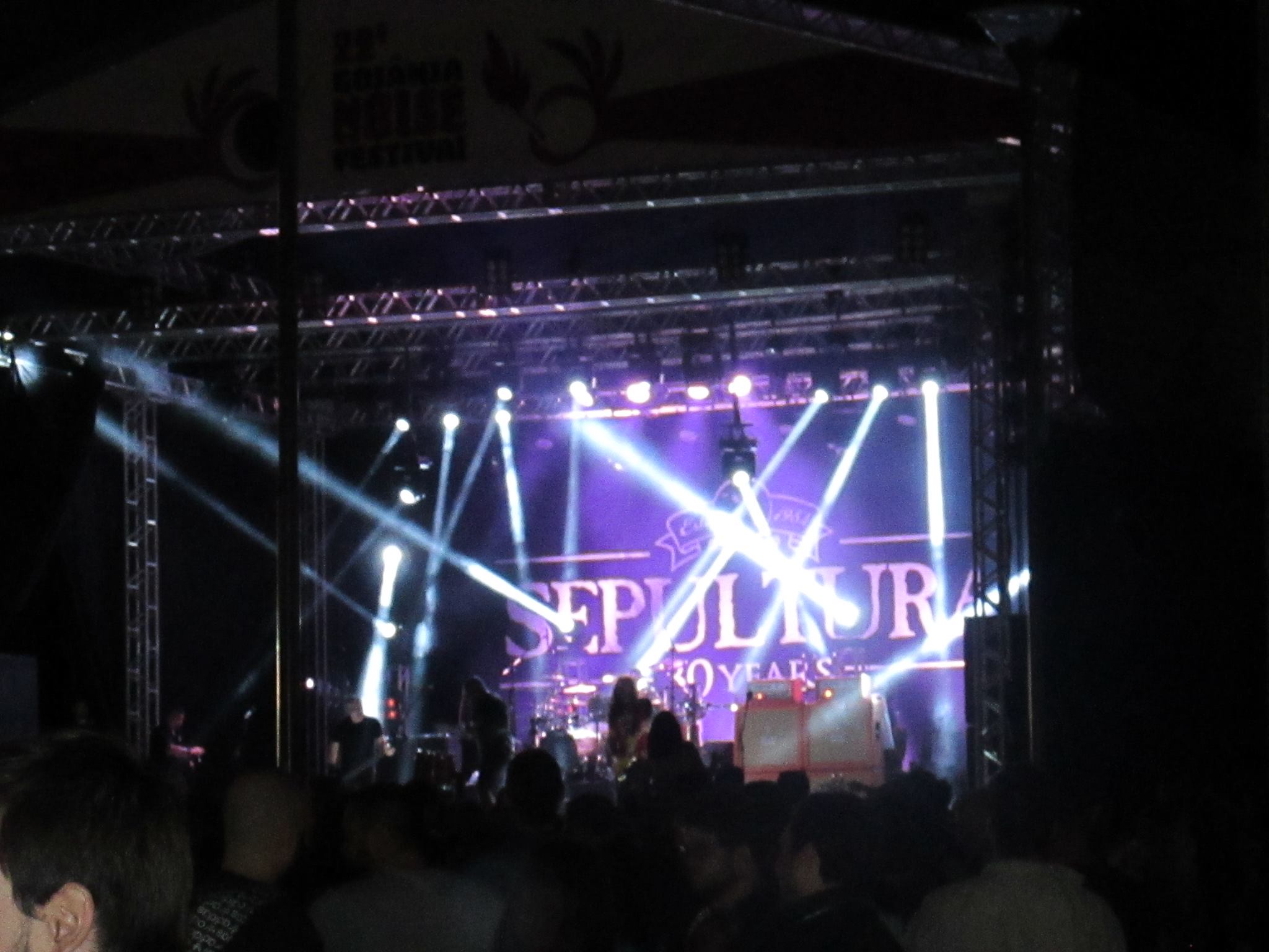 Saí na noite de sexta feira do dia 5 com meu companheiro para um vale-night, já que minha sogra ficou com nossa filha de 3,5 anos para que pudéssemos ir pro “regue” como se diz em Salvador. Somos forasteiros no planalto e são raras as oportunidades que temos de frequentar a noite goiana. Depois de parar em alguns bares, encontramos um bar bem bacana, que já estava fechando, onde conhecemos uma outra forasteira de Porto Velho – RO. Trocamos um papo bem legal e ela, meio sem graça por ter que informar que iam fechar, olha pra gente com uma sinceridade bem legal e diz: – Olha, sem querer estereotipar nem nada, mas assim, pelo estilo de vocês (jaqueta de couro e botas) acho que vocês vão gostar do festival que está rolando no Oscar Niemayer. Daqui a pouco vai rolar o Sepultura”. Eu, louca, que flertei com o Metal durante um tempo em SSA, pirei. Meu companheiro olha pra mim e diz “E ai, Bora lá?”. Como assim?